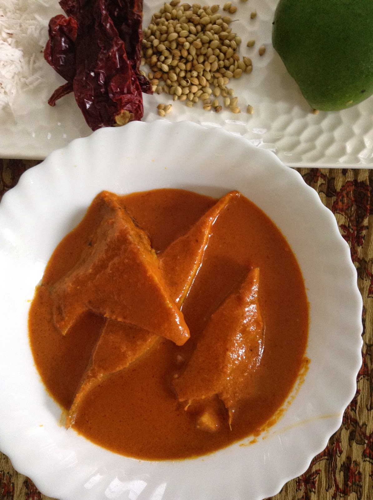 1/4 cup grated fresh coconut, 1/2 onion, 1 tsp raw rice, 1 tsp coriander seeds, 4 black peppercorns, 1/4 raw mango ( can be substituted with 1 tsp tamarind paste or 2 tsp dry raw mango powder) , 1/2 tsp turmeric, 4 dry red chillies ( the quantity of chillies can be varied according to taste. I use the kkashmiri chillies , which have a fiery red colour but are not hot) , salt to taste. 1 tblsp oil. Optional: 1 green chilli , slit.